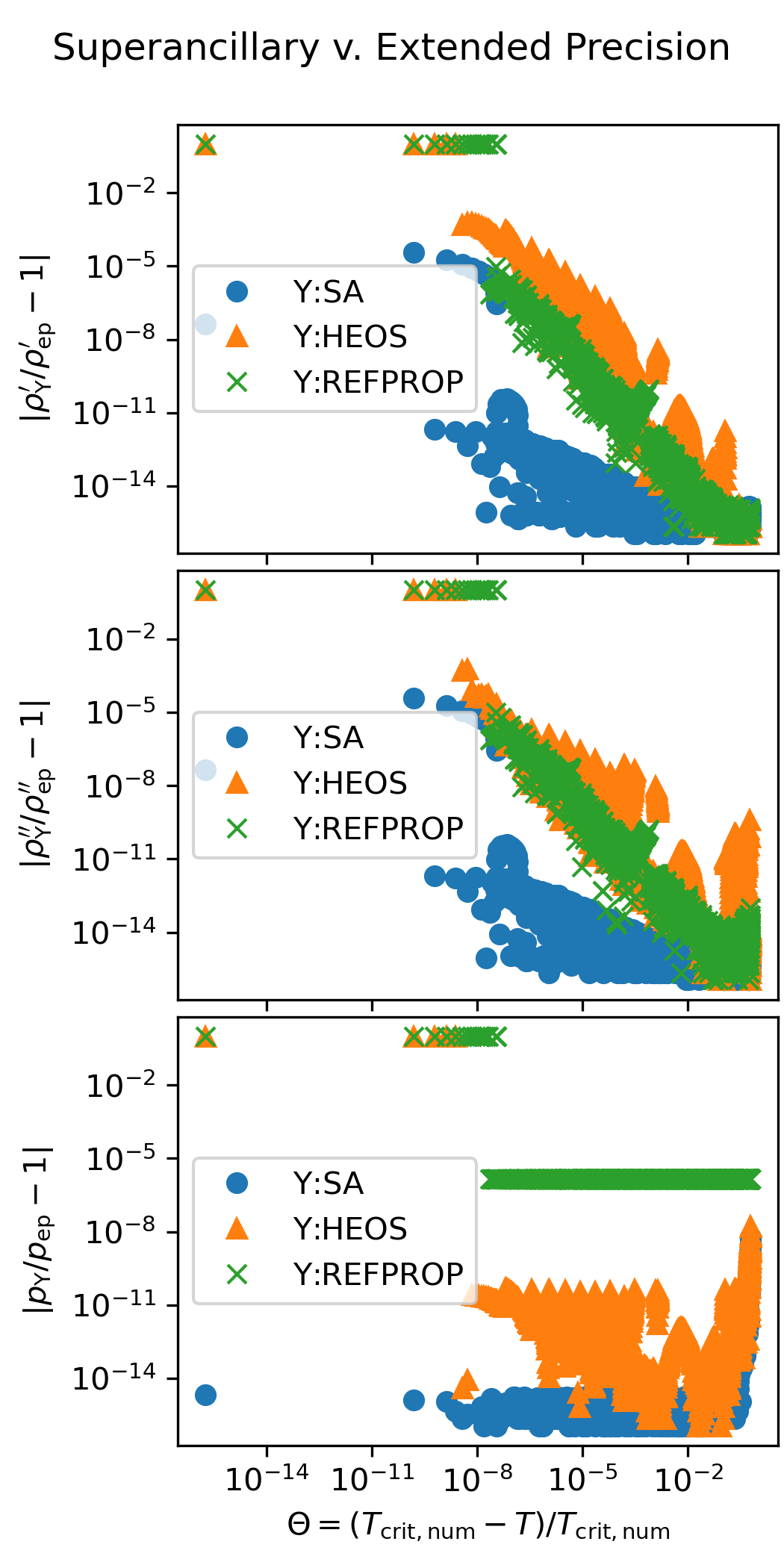 The following figure shows the accuracy of the superancillary functions relative to extended precision calculations carried out in C++ with the teqp library. The results of the iterative calculations with REFPROP and CoolProp are also shown.