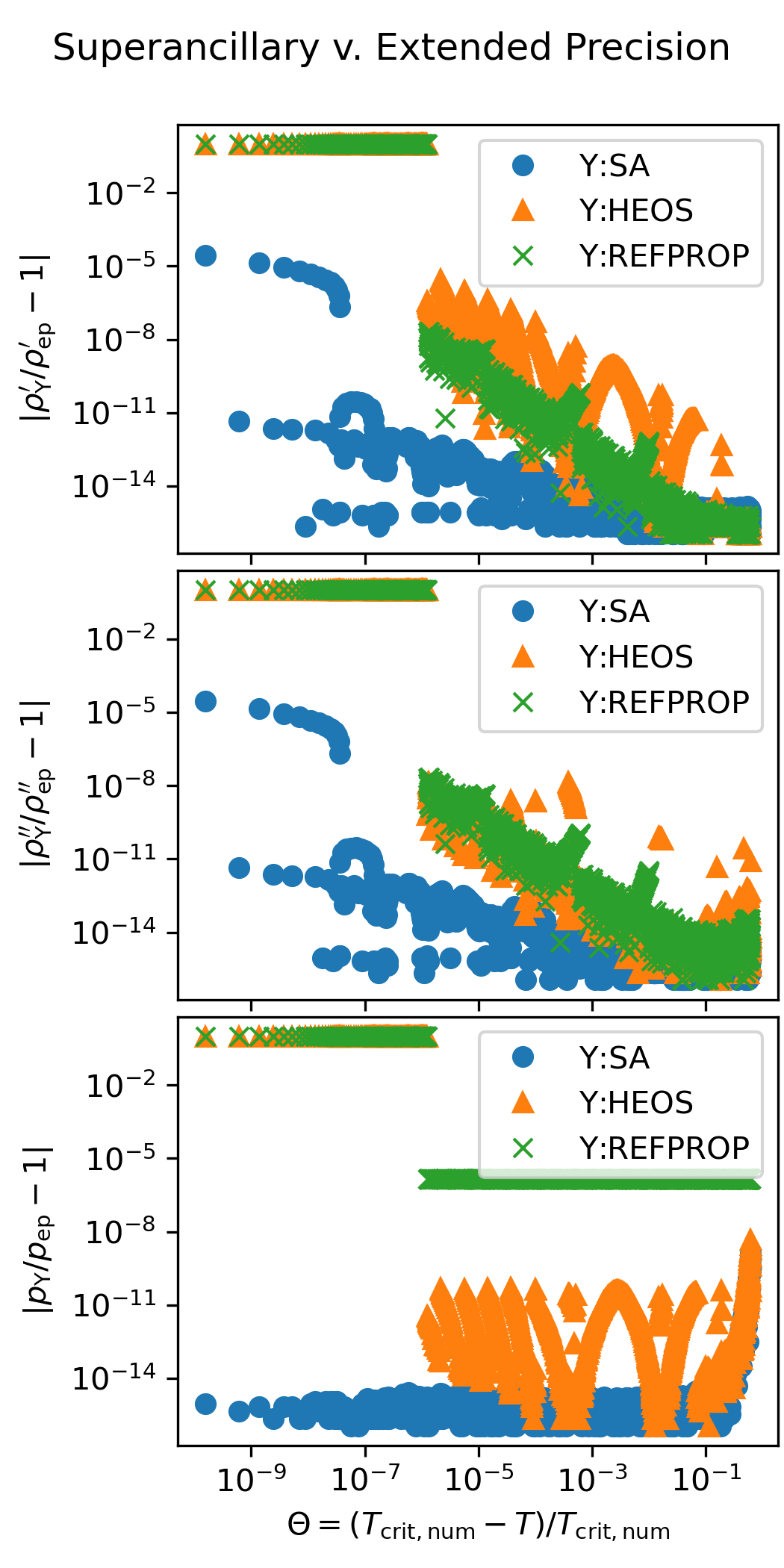 The following figure shows the accuracy of the superancillary functions relative to extended precision calculations carried out in C++ with the teqp library. The results of the iterative calculations with REFPROP and CoolProp are also shown.